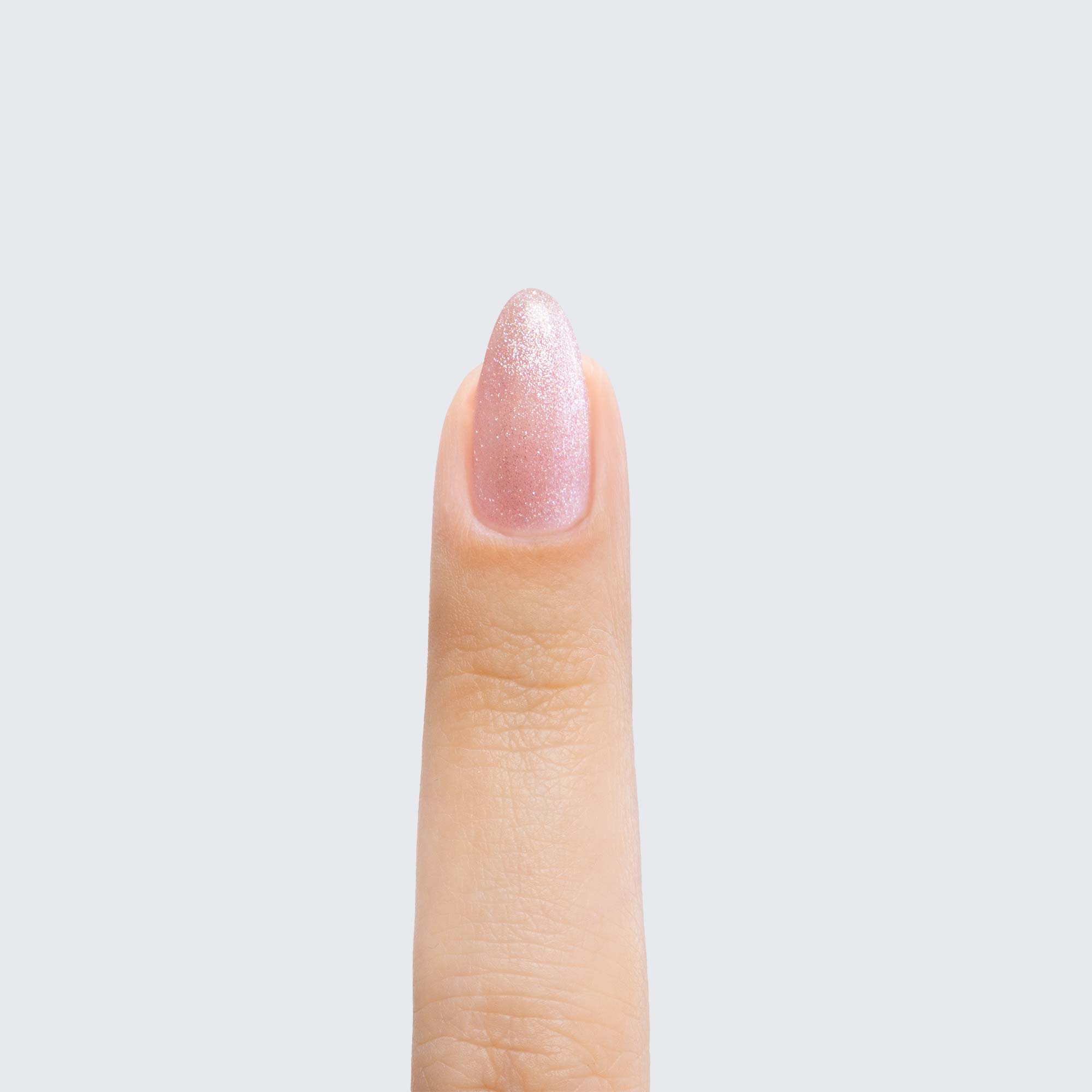 Pale pink with silver shimmer. Translucent. Semi-matte finish. Cool undertone.